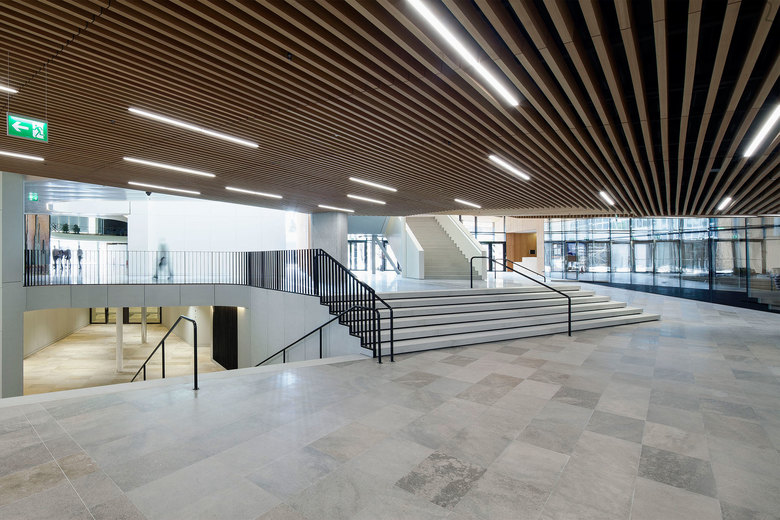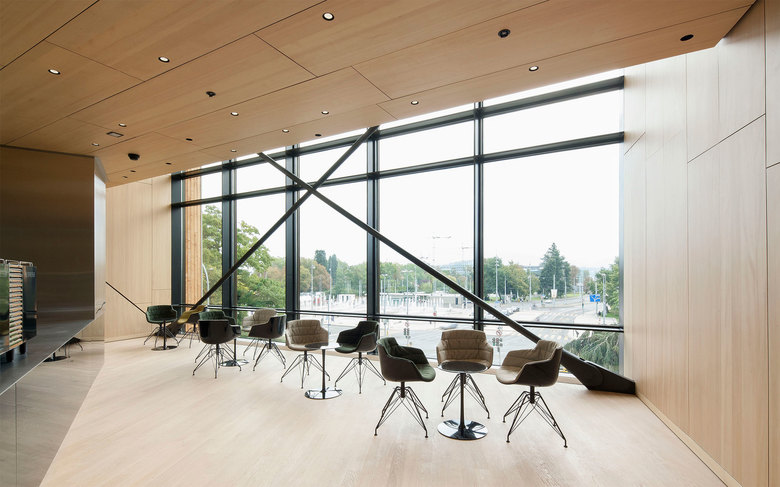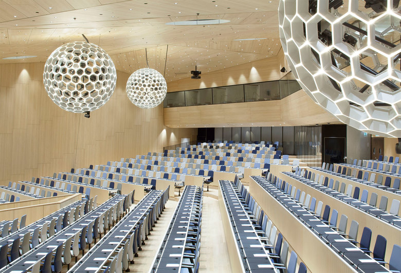 The conference hall, located on the second and third floor, has been designed to optimally satisfy the specific requirements of the WIPO: the 900 state of the art conference seats, oriented towards the stage without any hierarchy, are designed by Behnisch Architekten to ensure user friendliness and comfort. The auditorium is filled with homogeneous daylight streaming in through the north-facing glazing above the stage. High quality shading devices allow natural light to meet user-based needs.