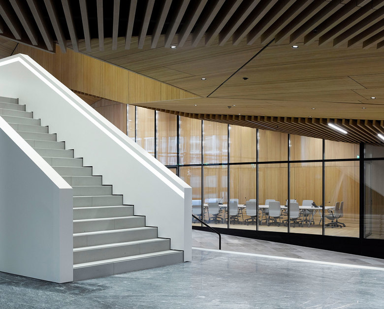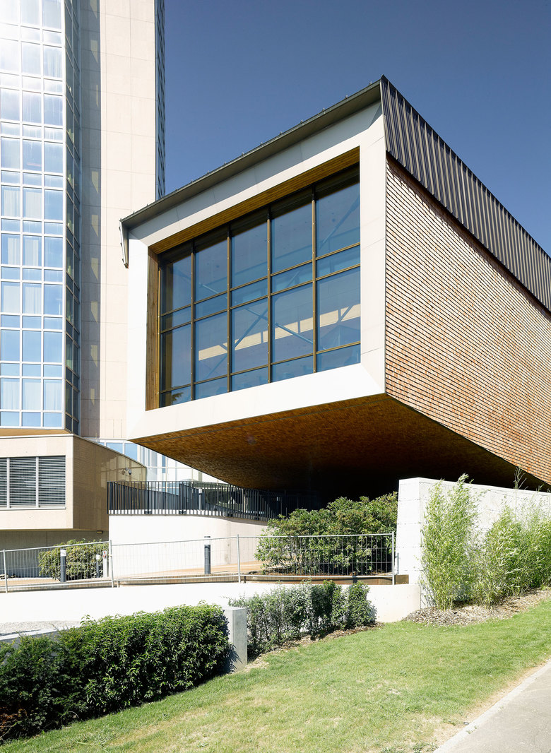 The lobby of the conference hall is a continuation of this garden landscape, separating the hall from its base and allowing it to seemingly levitate. This generous space also functions as the connection to the existing foyer of the AB building.