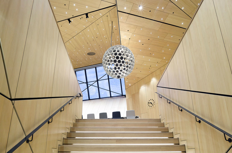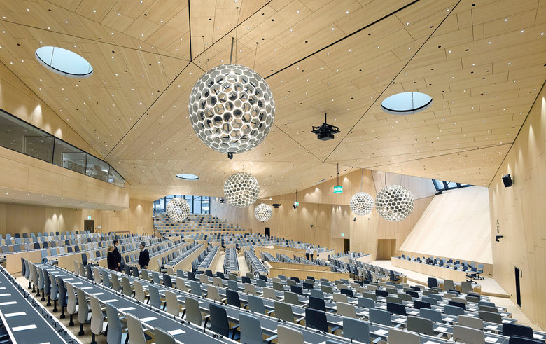 The new conference hall differentiates itself from its surroundings both in its geometry and its material quality. Surrounded by glass structures, this polygonal body is constructed entirely of indigenous timber. Wood is also prolifically used on the interior, where its haptic quality creates a gentle and pleasant ambiance. This choice of material and all choices in this project are based upon the attempt to create ecologically, economically, and socially sustainable built environments.