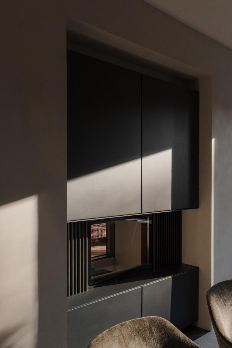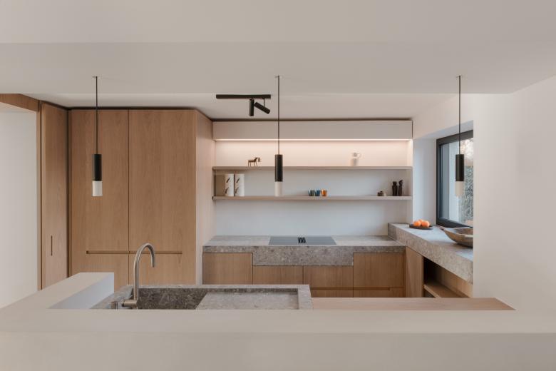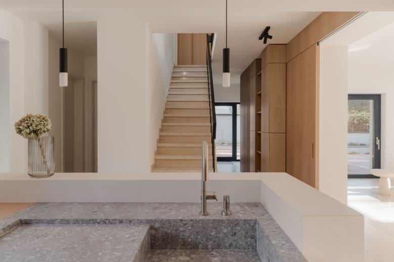 Natürliche Materialien dominieren den gesamten Innenausbau, darunter Eiche in Rohholzoptik, warmer Kalkputz, geschlämmte Ziegelwände und Ceppo-di-Gre-Keramiken, die auf allen Geschossen zu finden sind. Die Einbaumöbel sind durchdacht gestaltet, um Ästhetik und Nutzen in perfektem Einklang zu bringen. Raumhohe Schiebetüren, die nahtlos in die Möbel integriert sind, schaffen eine offene Atmosphäre, während Einbauschränke vorhandene Nischen effektiv nutzen.