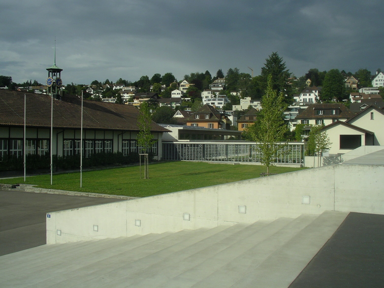 Eine Ebene tiefer spannt sich zwischen Neubau und dem alten Schulhaus ein zentraler Pausenhof auf. Um den ursprünglichen Gartencharakter aufzunehmen wurde ein Spezialkiesrasen entwickelt, der über das ganze Jahr hinweg witterungsunabhängig benutzt werden kann.