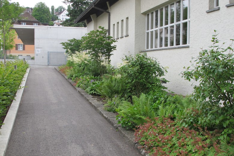 Die Aussenbereiche der neuen Grundstufe bieten abwechslungsreiche Bewegungs- und Spielflächen für die kleinen Kinder. Der Hof wird durch Grünflächen geprägt, die Höhendifferenz zum angrenzenden Gebäude als sanft modellierte Hügellandschaft ausgebildet. Darin eingebettet befinden sich Sand- und Wasserspielbereiche, zwischen Blütensträuchern entstehen Nischen und Schleichpfade. Als Kontrast dazu bietet der eingefasste Vorbereich an der Quartierstrasse Hartfläche für Roll-und Malspiele.