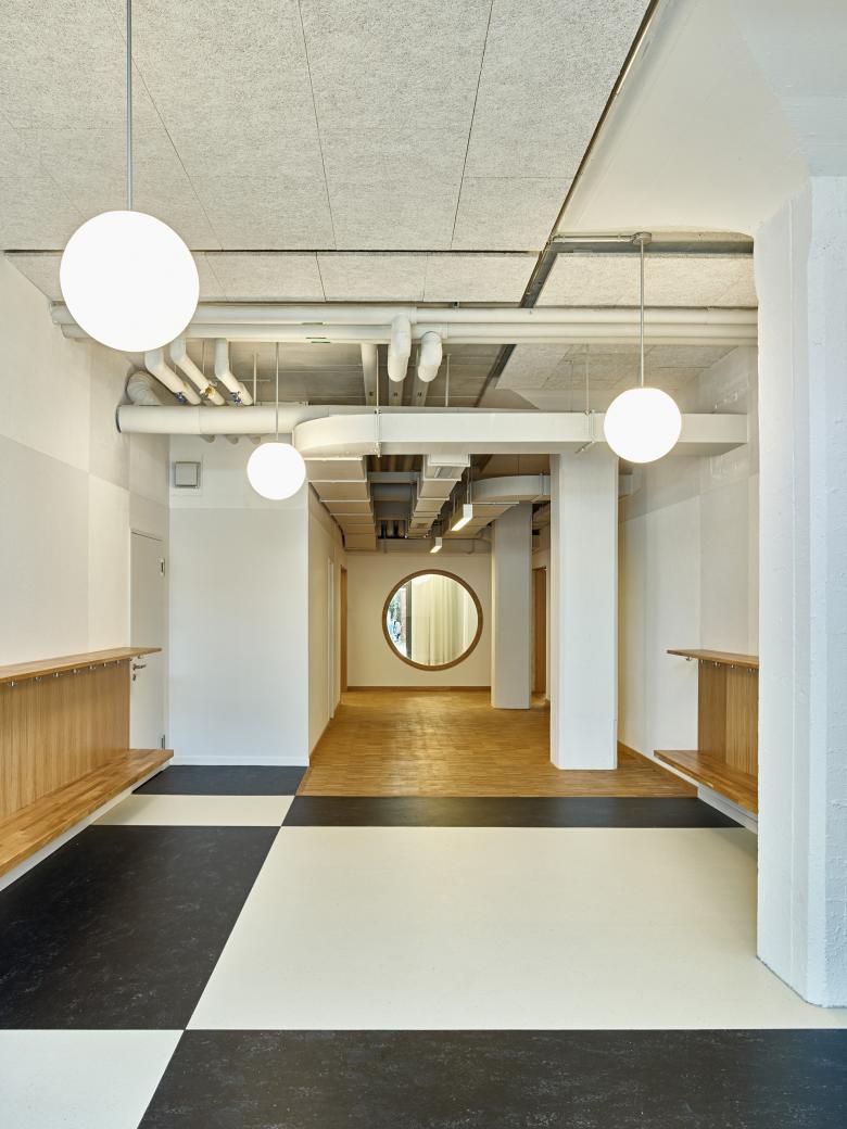 Der bestehende Kindergarten mit Betreuung im ehemaligen Zürcher Zollfreilager konnte durch die Anmietung benachbarter Gewerbeflächen um zwei Kindergartenklassen erweitert werden. Die Räume sind geprägt durch eine stattliche Raumhöhe und die markanten freistehenden Maillart-Pilzstützen. Dieser bestehende "Industriecharme" wurde bewahrt und gleichzeitig mit gezielten spielerischen Elementen eine kinderfreundliche und warme Atmosphäre geschaffen. Dezent farbige Wandflächen schaffen einen Kontrast zur hellen Stützenstruktur, abhängende Kugelleuchten, ein leichter Vorhang sowie der bestehende, teils ergänzte Holzboden bringen eine Wohnlichkeit und Leichtigkeit in die Räume. Die Garderobenzone ist geprägt durch einen karoartig verlegten neuen Bodenbelag, wo der bestehende Bodenbelag ohnehin ersetzt werden musste, Garderoben aus Holz sowie einem Rundfenster, welches Licht in den Korridor bringt sowie einen Bezug zwischen Schulraum und Garderobe erstellt.