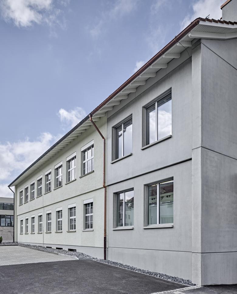 Das dreigeschossige Schreinereigebäude aus dem Jahre 1955 wird unter laufendem Betrieb instandgesetzt und erweitert. Damit den Anforderungen an die betriebliche Sicherheit und an den Bildungsplan für Lernende im Schreinereigewerbe Rechnung getragen werden kann, sind tiefgreifende Baumassnahmen nötig: Die gesamte Haustechnik wird erneuert, Brandschutzmassnahmen werden getroffen, eine neue Späneabsauganlage sowie ein neuer Lift eingebaut und durch Änderungen des Produktionslayouts wird der gesamte Betrieb optimiert. Der Erweiterungsbau ist von den funktionalen und betrieblichen Aspekten der Bauaufgabe bestimmt. Vorfabrizierte Thermowände in Sichtbeton ermöglichen eine kurze Bauzeit und bestimmen den konstruktiven Ausdruck des Anbaus. Der Erweiterungsbau aus roh belassenen Sichtbetonelementen führt das Gebäude in selbstverständlicher Art weiter, setzt sich aber gleichwohl durch Reduktion und Vereinfachung davon ab, so dass der neue Eingriff ablesbar bleibt.