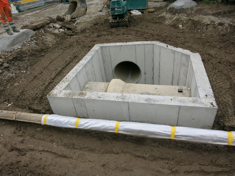 Ein bestehender Ortsbetonschacht wurde umgebaut um dem Mischwasserkanal DN 1000 eine neue Richtung zu geben. Der neue Mischwasserkanal (L = 130 m) wird über drei neue Richtungswechselnde Schächte wieder zurück auf die alte Linienführung gelenkt. Die Regenwasserleitung wurde auf einer Länge von 190 m neu verlegt. Beide Leitungen führen durch eine Schutzzone der Wasserversorgung.