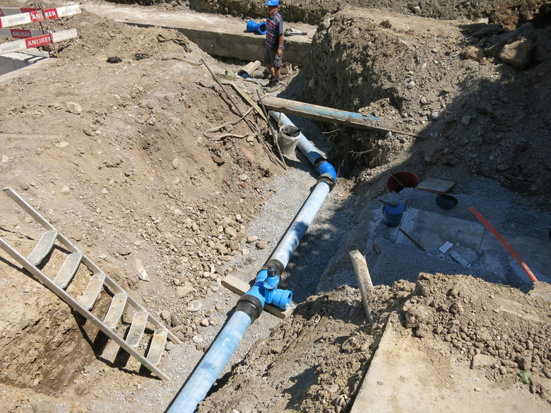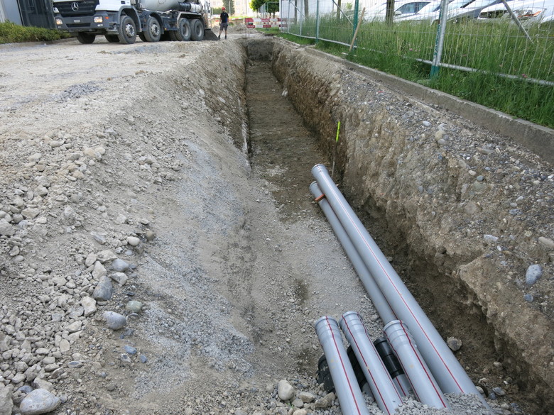Die bestehenden Entwässerungs-und Werkleitungen führten zwischen zwei Gebäude hindurch. Ein Gebäude wird rückgebaut und das neue wird an das bestehende Gebäude angrenzen. Somit müssen alle Leitungen eine neue Linienführung erhalten.