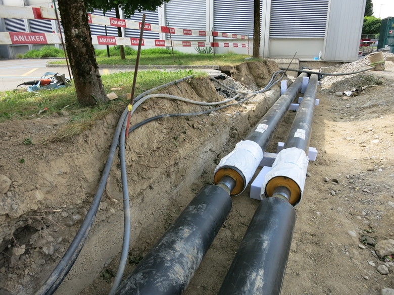 Dazu ein neues Fernwärmetrasse (125/280) zwischen den Gebäuden von rund 150 m Länge.