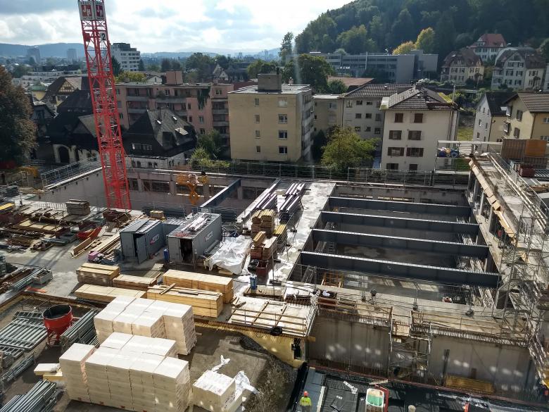 Die schlanken, weit gespannten Decken werden durch Stützen und Wandscheiben getragen. Die Tragelemente in den Schulgebäuden sind reduziert um möglichst flexible Grundrisse zu gewährleisten.