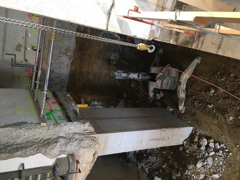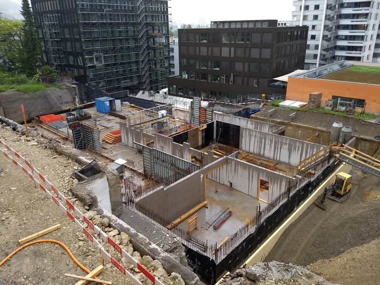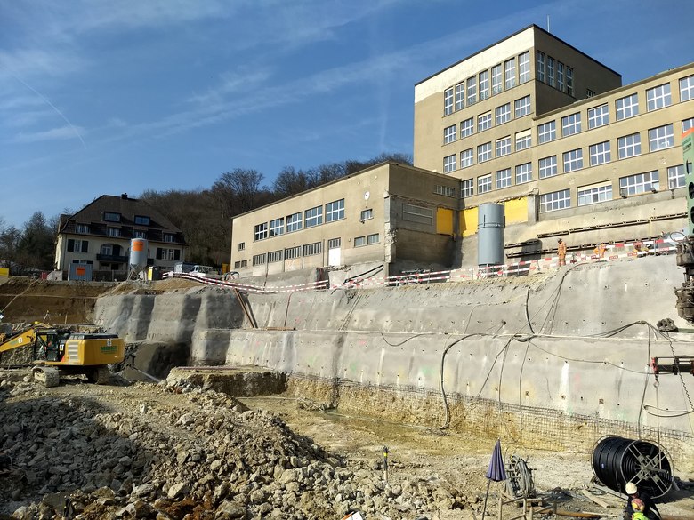 Die hohen Hangeinschnitte der Baugrube werden mit vorgespannten Litzenanker und Nagelwänden gesichert. In den engsten Stellen werden Rühlwände eingesetzt.