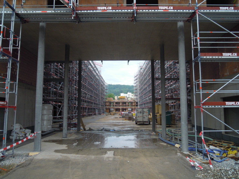 Die Gebäude sind flach fundiert und das Untergeschoss mit Einstellhalle und Kellerräumen deckt eine Grundfläche von über 12'000 m2 ab.