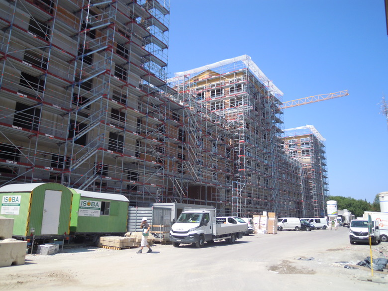 Drei neungeschossige Hochbauten die als längliche Riegel freistehend und Promenadenseitig miteinander verbunden sind. Die Erdbebenaussteifung findet über regelmässige Treppenkerne und einzelne ausgewiesene Wandscheiben statt.