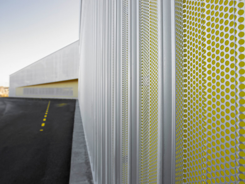 Schon von der Ferne verweist das Gebäude darauf, was im Inneren geschieht: Die Einfahrt zum Parkplatz scheint mittels eines Laserstrahls präzise und scharfkantig aus dem Gesamtkörper herausgeschnitten worden zu sein. Die dabei entstandenen Schnittflächen wurden mit gelb beschichteten und teils gelochten Flachblechen bekleidet. Dieser Farbe begegnet man in Kombination mit einem hellen Grau am und im gesamten Gebäude. Überall dort, wo im Innern geforscht wird, wurde die Dämmung mit einer gelben Folie kaschiert, die zwischen der gelochten Metallfassade durchscheint.