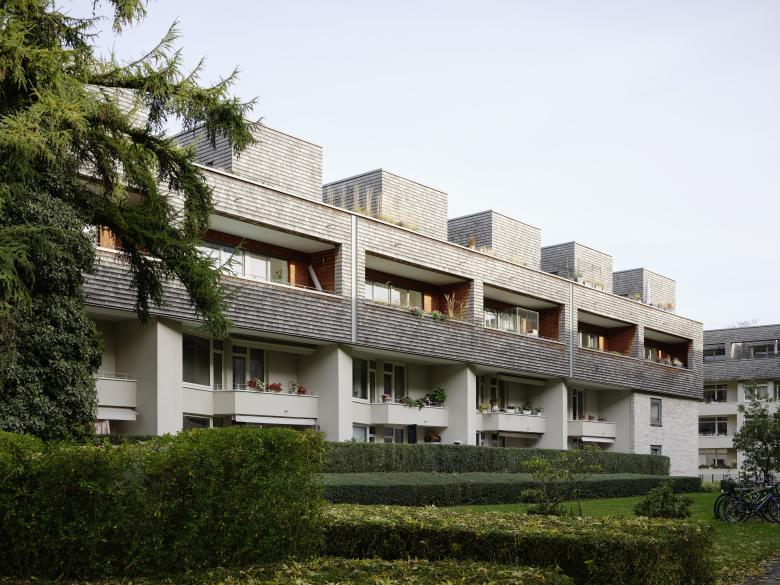 An den Fassaden der oberen Geschosse wurde der Baustoff Holz in seiner gewachsenen Unterschiedlichkeit roh in Form von gesägten Zedernholzschindeln verwendet. So wird die Leichtigkeit der Konstruktion nach außen getragen, der Neubau setzt sich klar von der massiven Bestandsbebauung ab und bezieht sich gleichzeitig auf den ihn umgebenden Baumbestand. Ein Großteil der insgesamt 47 Neubauwohnungen wurde als Maisonette-Typen ausgebildet. Dem Baumhaus-Konzept folgend, verfügen alle Wohnungen über großzügige Dachterrassen, die Maisonette-Wohnungen zusätzlich über Loggien. Die großzügigen Grünflächen zwischen den Gebäuden, die durch das Aufstockungskonzept erhalten werden konnten, wurden mit Kommunikations- und Spielbereichen aufgewertet. Insgesamt wurde mit der Planung das Ziel erreicht, die Wohnfläche der Siedlung zu verdoppeln und gleichzeitig den CO2-Verbrauch zu halbieren.