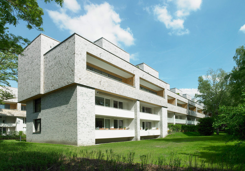 Die Aufgabe bestand darin, ein Wohnquartier aus den 50er Jahren in attraktiver City-Randlage zeitgemäß zu verdichten und energetisch zu sanieren. Die Bestandsbauten zeichneten sich ihrer Entstehungszeit entsprechend durch sparsamen Materialeinsatz und hohe Auslastung statischer Reserven in Konstruktion und Gründung aus. Vor diesem Hintergrund fiel die Entscheidung auf eine Aufstockung mittels Leichtbaukonstruktion in Holztafel-Fertigbauweise, die zudem auch den Vorteil mit sich brachte, in relativ kurzer Bauzeit und mit geringem Baulärm den Neubau über dem bewohnten Bestand zu realisieren. Sämtliche Wand- und Deckenelemente der Holzaufstockung wurden im Werk vorgefertigt und vor Ort zusammengesetzt. Die Bestandsfassaden wurden mit einer außenliegenden Dämmung versehen, die mit einem neuen Sichtmauerwerk verkleidet wurde- wie zuvor ein dänisches Dünnformat, allerdings in einem anderen Farbton. Die ursprüngliche Siedlung mit ihren künstlich anmutenden gelben Klinkern und türkisen Fliesen als Balkonverkleidung wurde in eine eher archaische Materialität von Handstrich-Ziegel versetzt.
