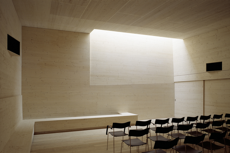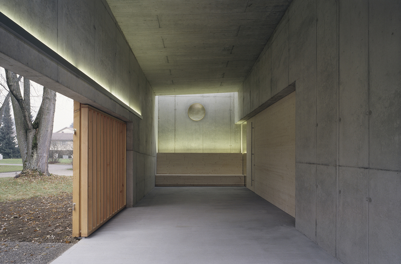Übergänge prägen den Baukörper. Die Vorhalle als Zugang von Westen wird als Aussenraum des Innenraums zum Innenraum des Aussenraums. In der zentralen Halle wird die Ostwand durch ein Oberlicht beleuchtet. Der Bezug nach oben erhält mit einem Bodenlicht ein Gegenüber und spannt so den Bogen zwischen Himmel, Erde und Wasser. Mit wenigen Öffnungen werden räumliche und symbolische Beziehungen geschaffen. Der skulpturale Massivbau in Sichtbeton bezieht sich auf den ganzen Friedhof. Durch helle Holzverkleidungen erhält der Innenraum eine meditative Stimmung.