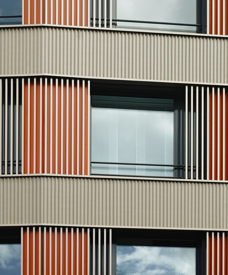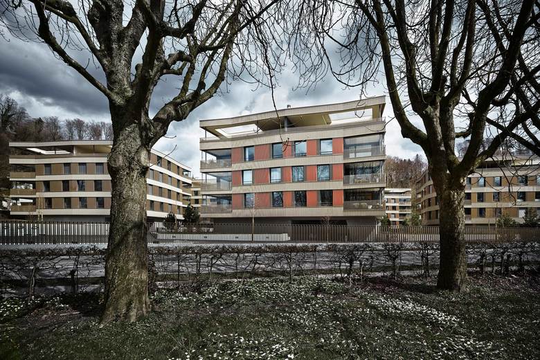 In Seenähe, an der Stadtgrenze von Luzern, wurde auf dem letzten freien Grundstück eine Wohnüberbauung erstellt. Sechs zuei­nander leicht verdrehte Punkthäuser definieren den Ort, sodass ein ausgewogenes Verhältnis zwischen Bebauung und Freifläche entsteht. Die lockere Anordnung der Häuser bewirkt eine Leichtigkeit, erzeugt fliessende Aussenräume und etabliert ein vielfältiges Netz an Sicht- und Raumbeziehungen innerhalb der Überbauung und zum See. Horizontale Bänder aus Keramikplatten und Segmente farbig hinterlegter Bronzestäbe zwischen den Öffnungen verleihen den Fassaden eine irisierende Wirkung. Diese wird durch die Verdrehung der Häuser verstärkt und lässt die Gebäude je nach Sichtwinkel und Lichteinfall einmal monochrom, einmal in dezentem Farbenspiel erscheinen. Die drei bis vier Wohnungen pro Geschoss sind übereck angeordnet, sodass jede von einer zwei- bis dreiseitigen Ausrichtung profitiert. Ergänzt werden die attraktiven, gut besonnten Wohnbereiche durch gross­zügige Loggien.