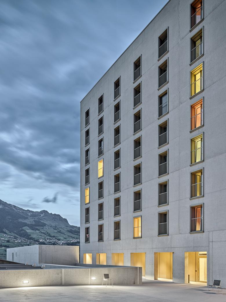 Das Erweiterungs-Projekt schafft durch die Setzung eines markanten Hochbaus an der Hangkante einen baulichen Akzent. Südseitig wird die bestehende Sporthalle als topografischer Eingriff durch die neue Sporthalle mit Werkhof ergänzt. Diese beiden Interventionen führen zu einer stärkeren Fassung des Aussenraumes und ordnen die Anlage sowohl räumlich wie funktional neu. Der neungeschossige Unterkunftstrakt wird durch einen eingeschossigen Flachbau mit dem Hauptgebäude verbunden. Dabei ordnen zwei Lichthöfe die Struktur der neuen Gemeinschafts- und Theorieräume und führen Tageslicht ins Untergeschoss. Als Pendant dazu werden im Bereich der Sporthallen zwei weitere Lichthöfe gesetzt, welche an der Schnittstelle von Alt- und Neubau Tageslicht spenden. Davon ausgehend entwickelt sich die neue Sporthalle mit den längsseitig angeordneten Nebenräumen über drei Etagen und findet im Werkhof ihren oberen Abschluss. Durch die Setzung der beiden neuen Programmteile wird das Untergeschoss zu einem Ort räumlicher und sozialer Vernetzung, welcher Bestand und Neubauten zur gewünschten Einheit verbindet. Die Neubauten treten als gegossene Betonkörper in den Dialog mit den ebenfalls in Beton ausgeführten Bestandesbauten. Durch die sandgestrahlte Oberfläche erfahren sie jedoch eine leichte Differenzierung.