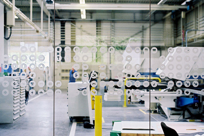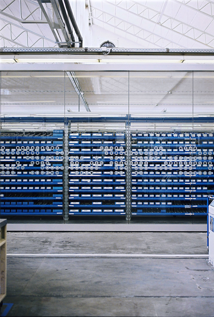 Das Logistiklager für Stanzwerkzeuge wird als großes Schaufenster ausgebildet. Dies ist Sinnbild der schnellen Produktionsabläufe des Unternehmens und befindet sich am Ende des linear in der Halle angeordneten Produktionsablaufes. Grafische Signets zeigen die vielseitigen Formvarianten der Werkzeuge.