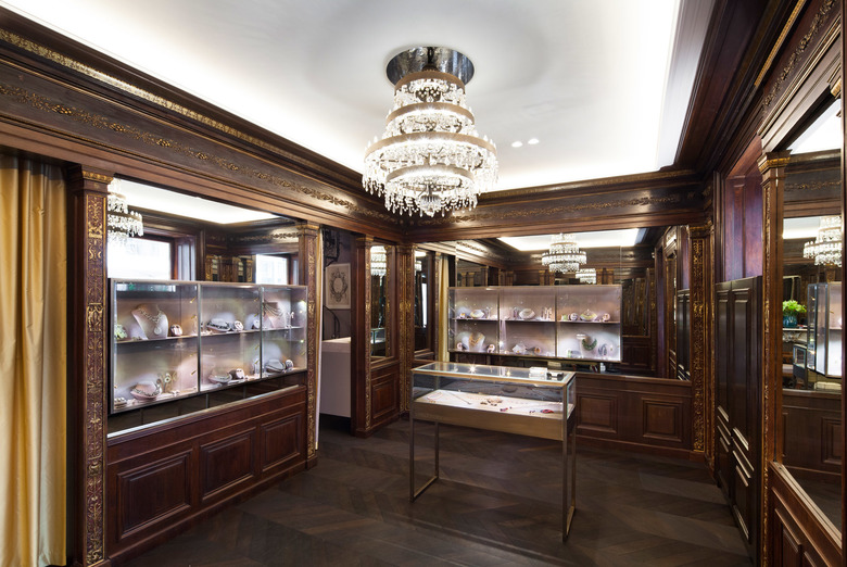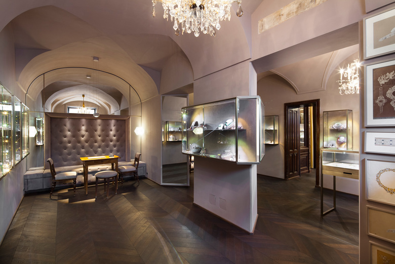 Innenausstattung eines Wiener Traditionsjuweliers: Geschäftslokal, Werkstätte und Kundenzone im 1. Obergeschoß.