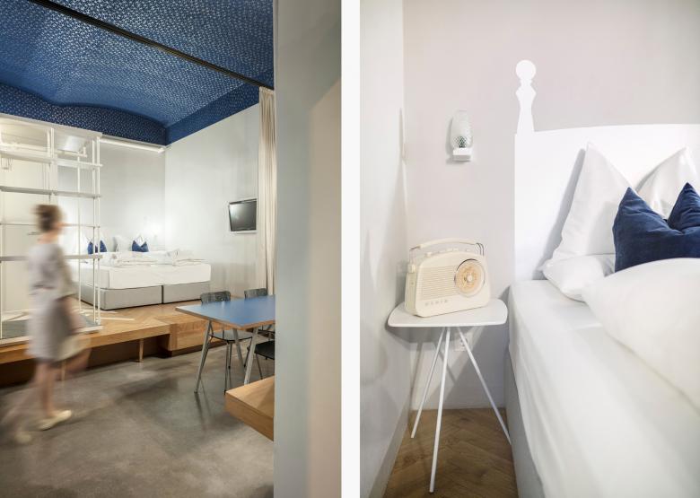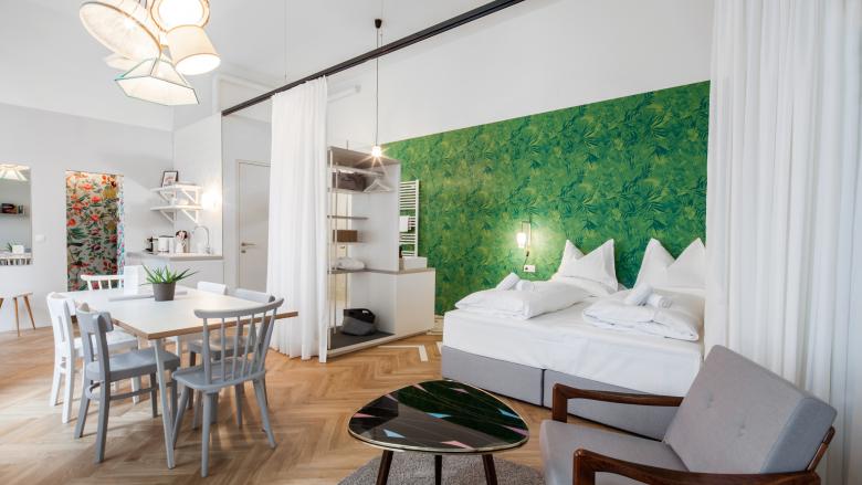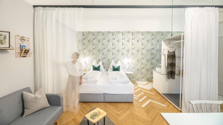 Die Suiten gleichen kleinen Wohnungen. Ihre Gestaltung folgt einem urbanen Stil des situativen Reflektierens der Umgebung: In geschmackvolles, hochwertiges Design wurden lokale Elemente integriert. Alle Suiten verfügen über ein hohes Ausstattungsniveau und sind in ihrer Atmosphäre und Gestaltung individuell wie die Gäste des grätzlhotels.