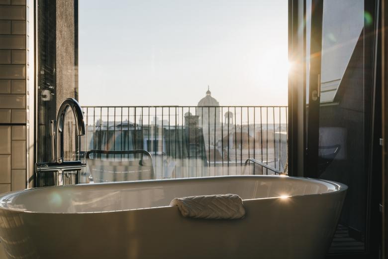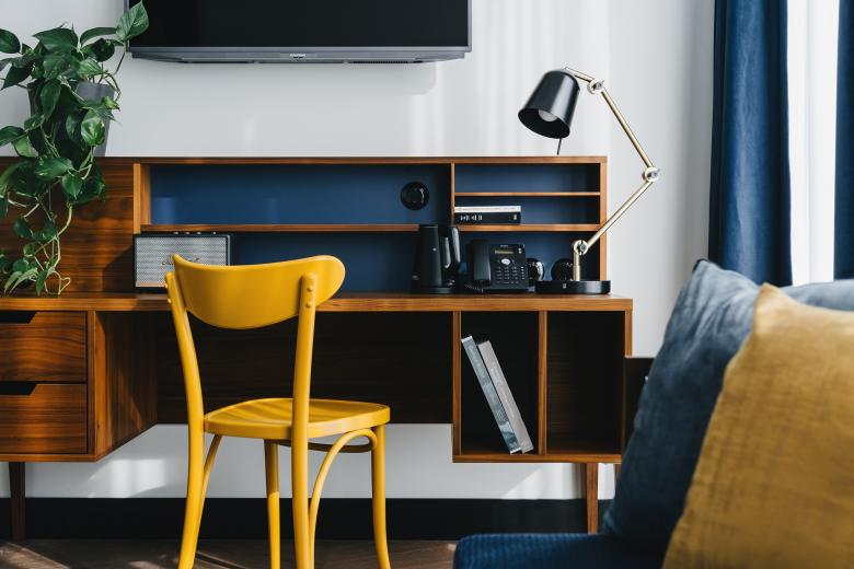 Über dem Ganzen erstreckt sich eine Galerie, von der man einerseits die Konferenz- und Meeting-Räume und andererseits den Coworking-Space erreicht. Die Gänge zu den Zimmern sind bewusst dunkel gehalten, wie Erich Bernard betont. „Auch das ist in gewisser Weise ein Modell aus Skandinavien, wo man erkannt hat, das dunklere Gänge für Beruhigung und Entschleunigung sorgen und die Gäste dazu anregen, langsamer zu gehen“, so der Architekt. Auch in den rundum erneuerten Zimmern und Badezimmern setzt man auf klassische Designelemente, ohne in die „Retro-Falle zu kippen“, wie es Bernard ausdrückt. Auf aufdringliche Wien-Details in den Zimmern verzichtet man bewusst. Lediglich das sogenannte Wiener Geflecht, das man von den klassischen Kaffeehausstühlen kennt, findet sich etwa an Schranktüren und Betthäuptern und erinnert den Gast auf diskrete Weise daran, in welcher Stadt er sich gerade aufhält.