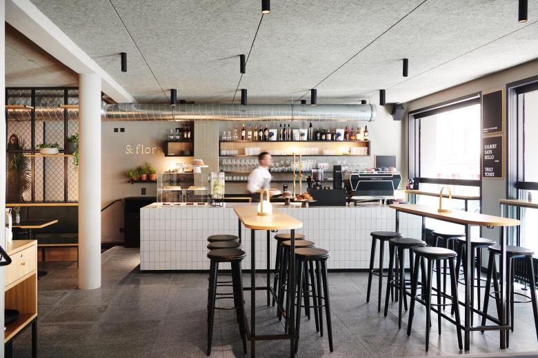 Betreten wird das Gebäude mit der nun begrünten Fassade durch zwei Eingänge. Einer der beiden dient als Haupteingang und führt direkt zu Rezeption. Durch den anderen erreicht man die Café-Brasserie „&flora“, die untertags wie abends zu zwanglosem Miteinander einlädt. Wie der Name des Lokals vermuten lässt, sorgen Pflanzen in seinem Inneren für eine Atmosphäre, die an einen Blumenladen erinnert. Großzügig öffnen sich die Fenster zum Schanigarten in der Breite Gasse. Für Gartenatmosphäre sorgt auch ein Gitter, das die Bar vom zentralen glasbedachten Innenhof trennt und dabei an einen Gartenzaun erinnert.