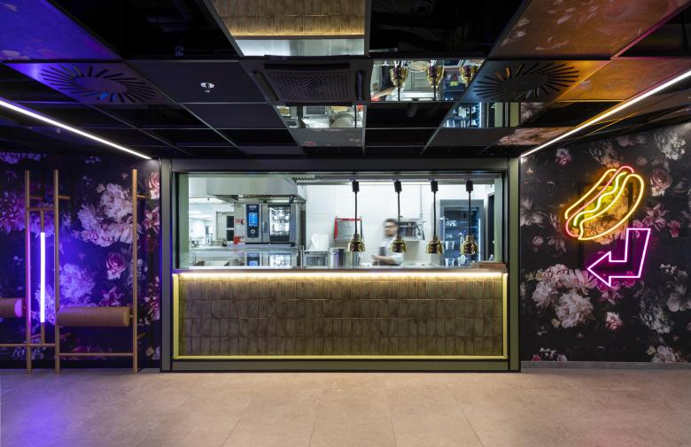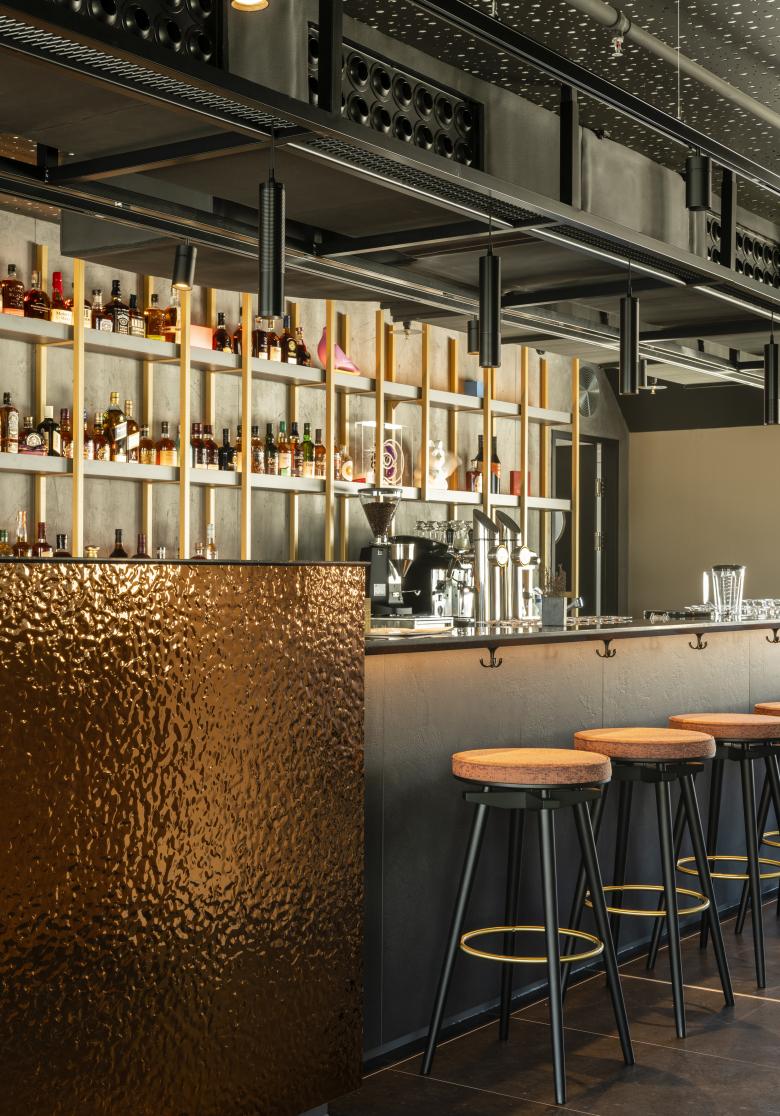 Große Öffnungen zwischen Gang und Lobby auf der einen und dem Bar- und Frühstücksbereich auf der gegenüberliegenden Seite sind mit industriell anmutenden Rolltoren versehen, die je nach Bedarf hoch- oder runtergefahren werden. In ihrem urbanen, garagentorähnlichen Design betonen sie den allgemeinen Studio-Aspekt des Projekts. Der Gang führt zudem vorbei an einer offenen Küche mit der Leuchtschrift „Würstelstand“, an der morgens Frühstücksgerichte und abends Streetfood ausgegeben wird. „Das Jaz in the City soll ein Ort sein, der sich stark mit der Stadt verbindet“, fährt Architekt Bernard fort, „ein Treffpunkt für die heimische Szene gleichermaßen wie für Musiker und Musik-Enthusiasten aus aller Welt. Wer sich mit Musik beschäftigt, soll sich hier wohlfühlen und die Stadt Wien dabei auf vertrautem, musikalischem Territorium erleben.“ Geschehen wird das nicht zuletzt am Dach des Hotels, wo die Rooftopbar mit goldglitzernder Theke sich auf eine Terrasse mit Blick über Wien öffnet.