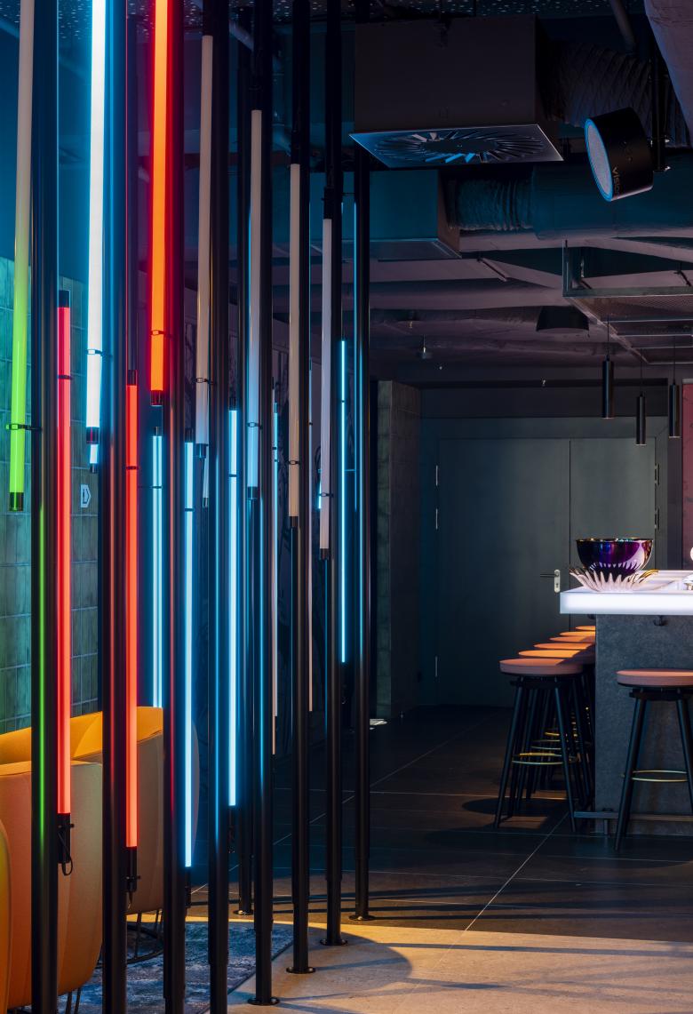 Fortgeführt wird das Konzept in so gut wie allen Bereichen des Hotels. So steht etwa im Zentrum der Lobby, links nach dem Entree, ein schallgedämmter Glaskubus, der optisch an ein Aufnahmestudio erinnert. Und sowohl als solches wie auch für Meetings und gegebenenfalls für Live-Sendungen genutzt werden kann. Gegliedert ist die Lobby in unterschiedliche Sitz-Inseln, die zum Teil wie offene Käfige von Mettalstangen umfasst sind, was eine gewisse Intimität erzeugt, ohne das Geschehen im Raum auszusperren. Entlang der Wand erstreckt sich der Red Amplifier, eine langgezogene Nische, die in verschiedenen Rottönen gehalten ist und an einen gewaltigen Verstärker erinnert.