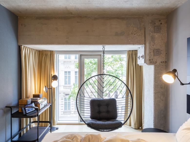 Zu den 163 Zimmern gelangt man durch Flure, die den Eingängen zu Musikclubs nachempfunden sind und optisch das Sujet des Verstärkers aufgreifen, während auch in ihrem Inneren das Thema Musik auf unübersehbare Weise die Hauptrolle spielt. „Die Zimmer bieten ein Ambiente, in das sich die Musiker einfühlen können“, erklärt Architekt Bernard, „in denen man unplugged üben und sich in die Atmosphäre eines Auftritts hineindenken kann.“ Auch verfügt jedes Zimmer über seinen eigenen Plattenspieler, sodass auch Gäste, die nicht gerade üben müssen, Schallplatten etwa aus dem hauseigenen und gutsortierten Record store hören können.