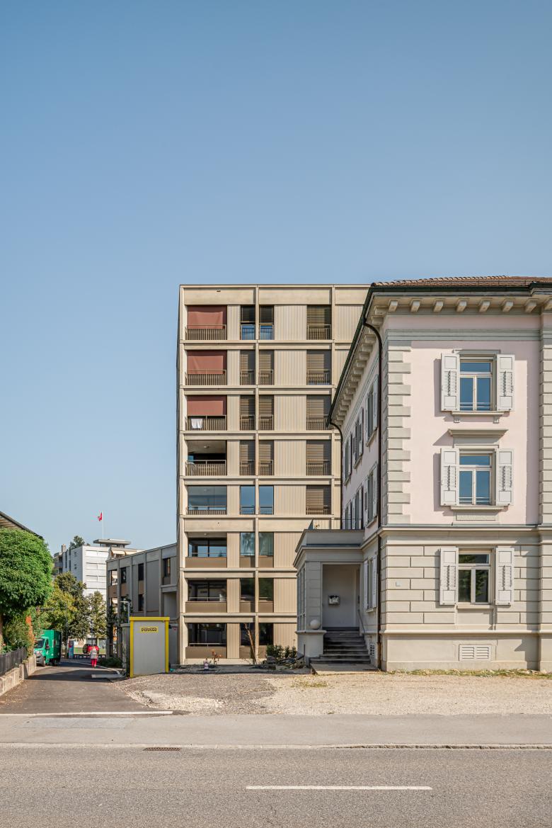 Zur Strasse im Norden befindet sich ein breiter Eingangsbereich für die öffentliche Nutzung. Nordwestlich und östlich des Wohnhauses bilden sich zwei offene Plätze. Der eine enthält einen Aufenthaltsbereich und einen Spielplatz für die Bewohner. Der andere Platz bildet einen offenen Begegnungsplatz in der Nähe des Einganges für das Wohnhaus. Das denkmalgeschützte Polizeipostengebäude bildet den Abschluss des Areals. Zwischen den zwei Gebäuden entsteht ein privater Aussenraum für die Bewohner.