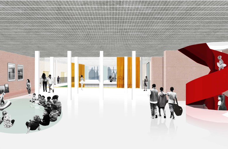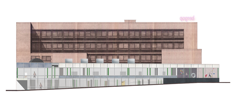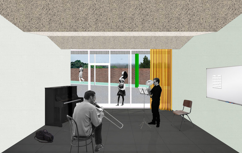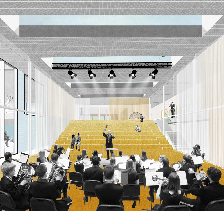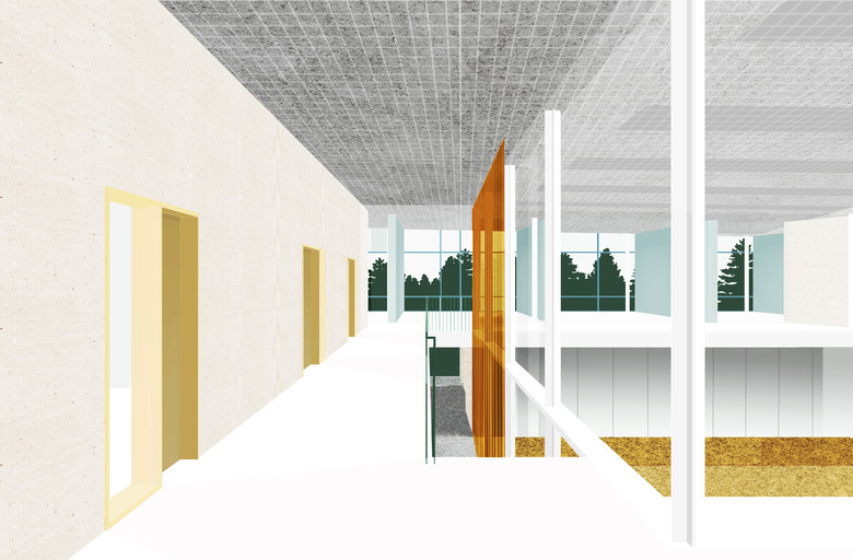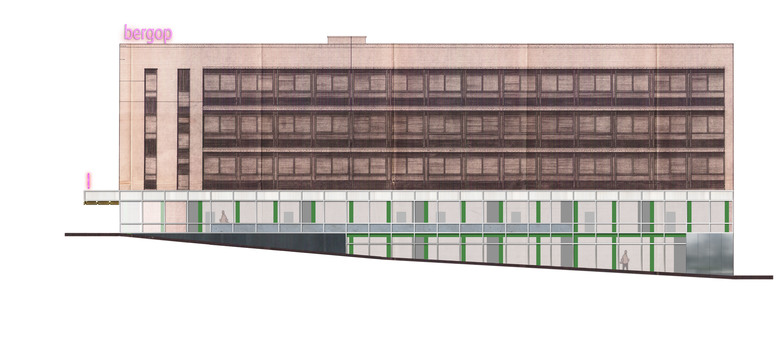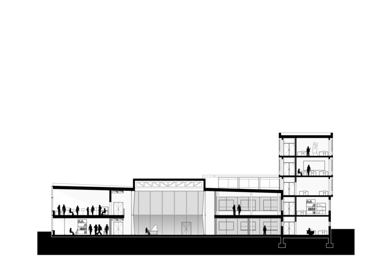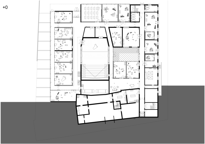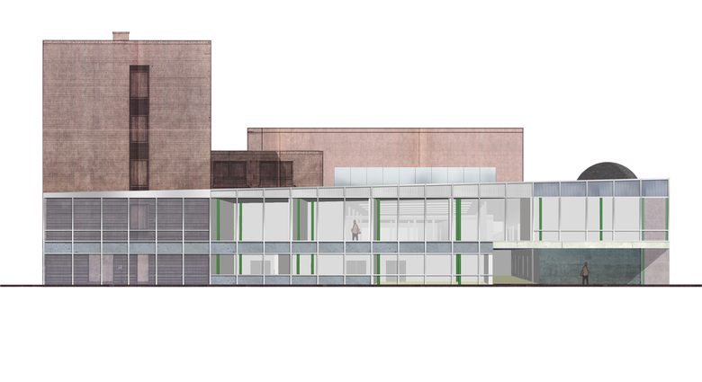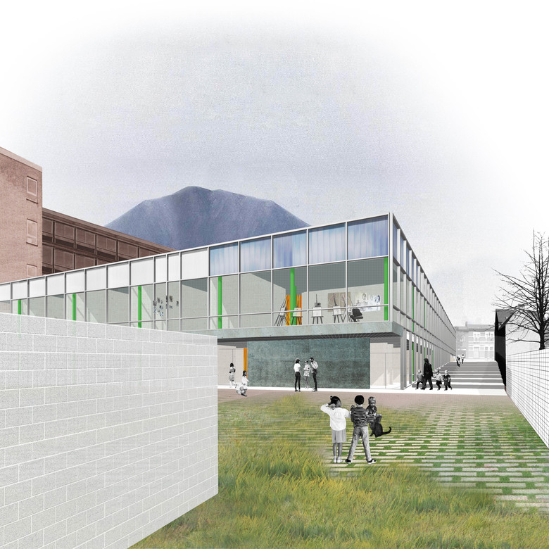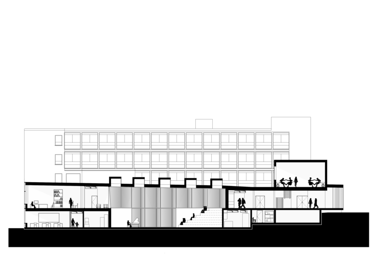 We wish to complete the unfinished, by filling up the void and thus, maximizing both internal and external contact surface. A new two-storey pedestal reacts to the topographical height difference and creates a horizontal academic “landscape”. MWD is thus acoustically buffered in the lower levels, with a minimum in height shifts, whilst VGA luxuriates in the light and vistas of the upper levels. The opportunities to meet are plentiful, as we firmly believe in the creative energy of human synergy.