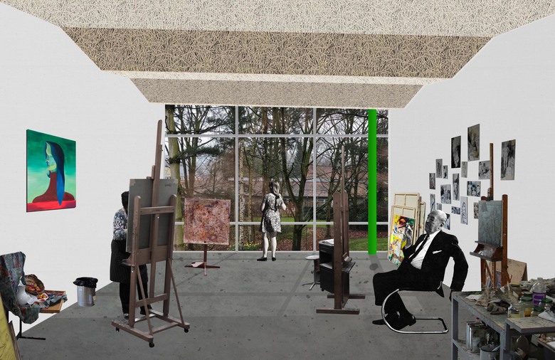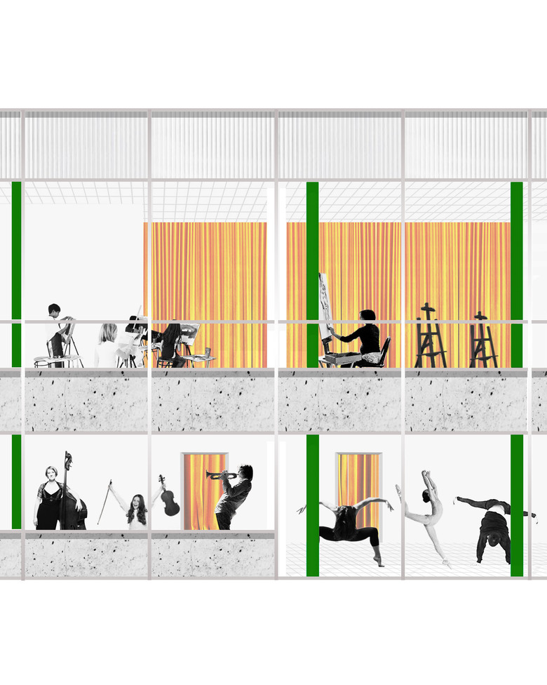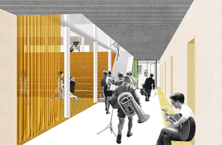 The original renovation plans reveal how the as-built is apparently incomplete: certain wings remain unbuilt, leaving a somewhat amputated-looking building from the outside. Inside however, the open and tactile sub-reality of the creative community reveals itself: for lack of a core communal space where the different art forms can meet, the corridors are packed with supplies, art pieces, instruments and installation tools.