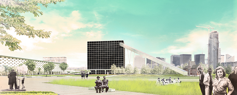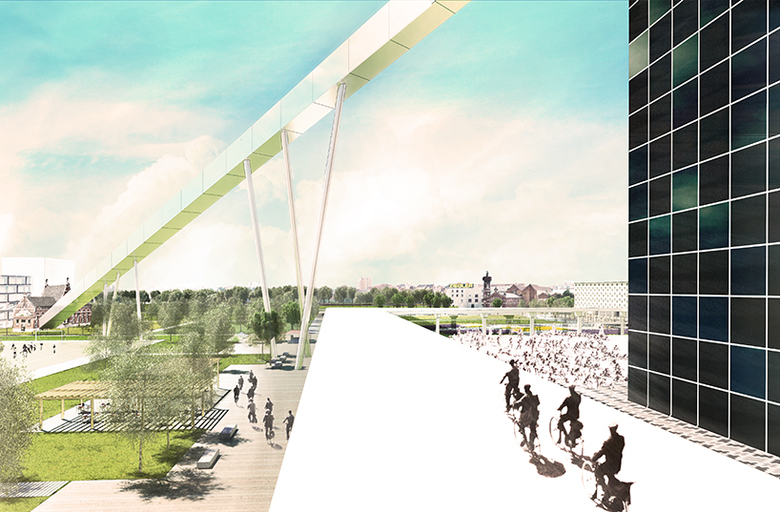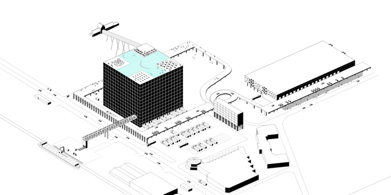The existing elevated road wraps around the 80x80 meter cube and provides a panoramic view of the park with public activities and sports fields. It is also a connection that may host food markets, concerts, street theater and so on.