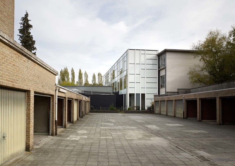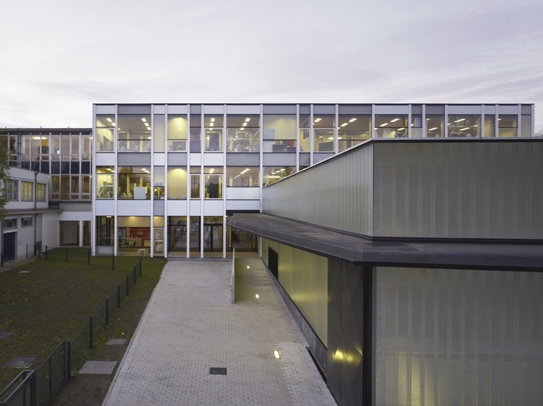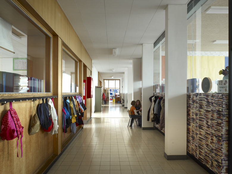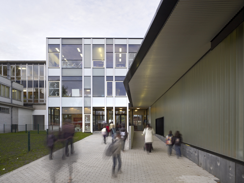 isolerende schil bij. En een face-lift in de vorm van een freile glazen structuur, een uitvergrote kijkdoos. Tussen de gang en de nieuwe klassen steekt één grote kast als een soort veredeld en functioneel littekenweefsel.