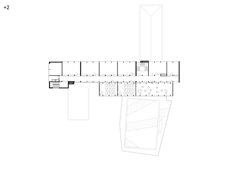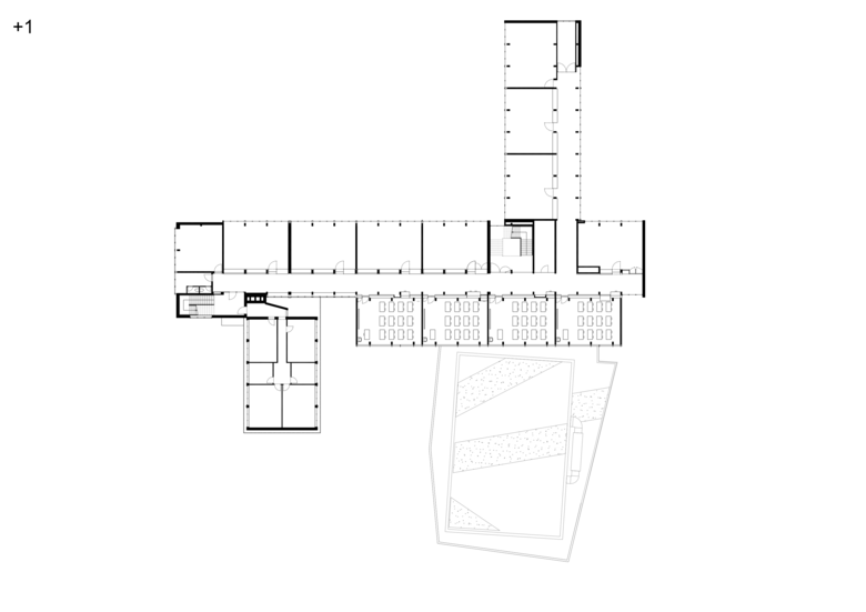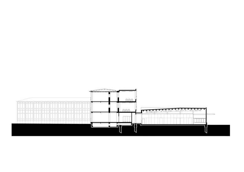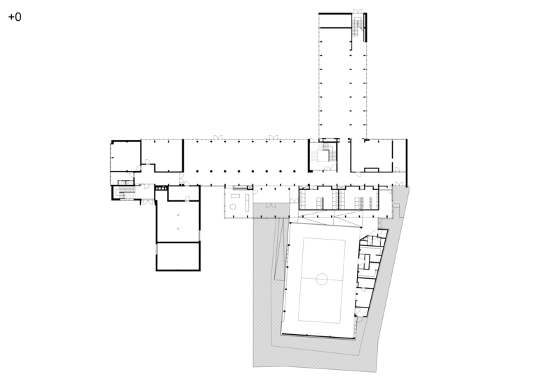 De twee programma-onderdelen halen we vanaf het begin netjes uit elkaar. Een driehoog klassen-balkje van 6meter op 36 meter en 10 meter hoog wordt tegen de bestaande voorgevel geplaatst. Hierdoor recupereren we niet enkel de bestaande gang en riante verdiepingshoogte, de oude school krijgt er aan de noordzijde meteen een duurzame,