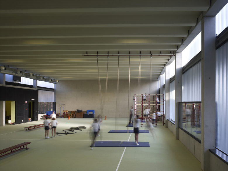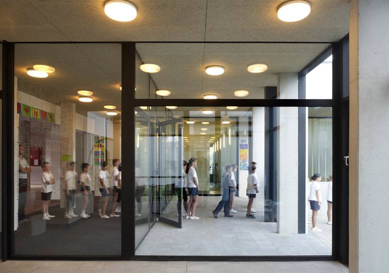 De polyvalente zaal is als een glazen kei op het binnengebied gelegd en lichtjes de school ingeschoven. Een stalen luifel omkranst het monovolume en leidt kinderen en ouders meteen naar de nieuwe hoofdinkom.