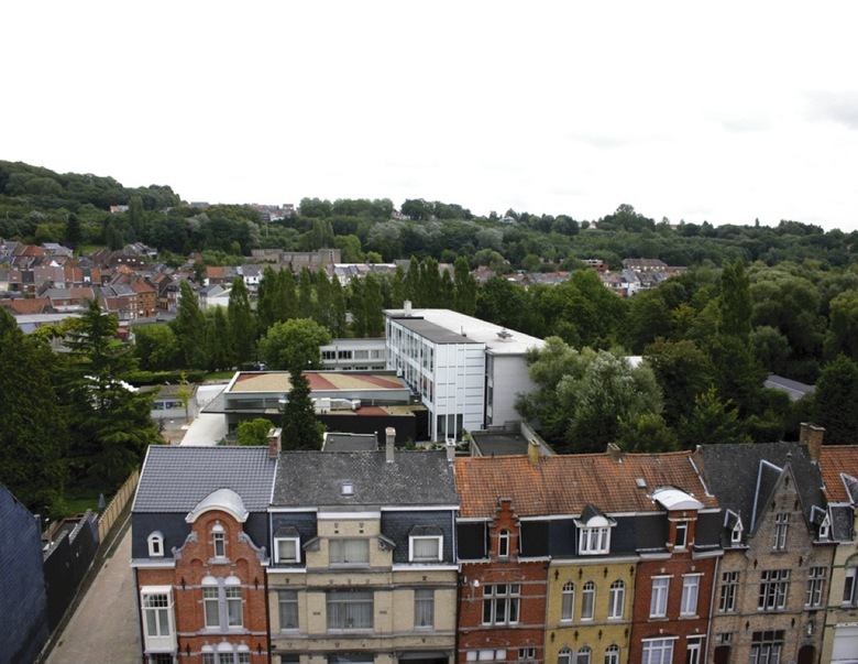 De basisschool nestelt zich in een absurd volgestouwd binnengebied aan de Dender, De uitbreiding met 8 extra klassen en een grote polyvalente ruimte verhoogt de druk op de restruimte nog even exponentieël.