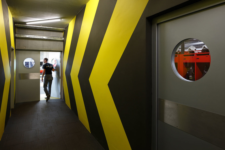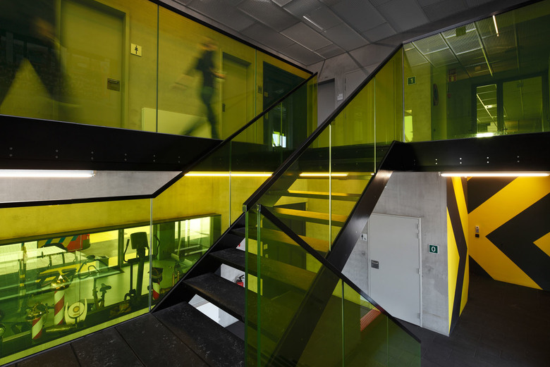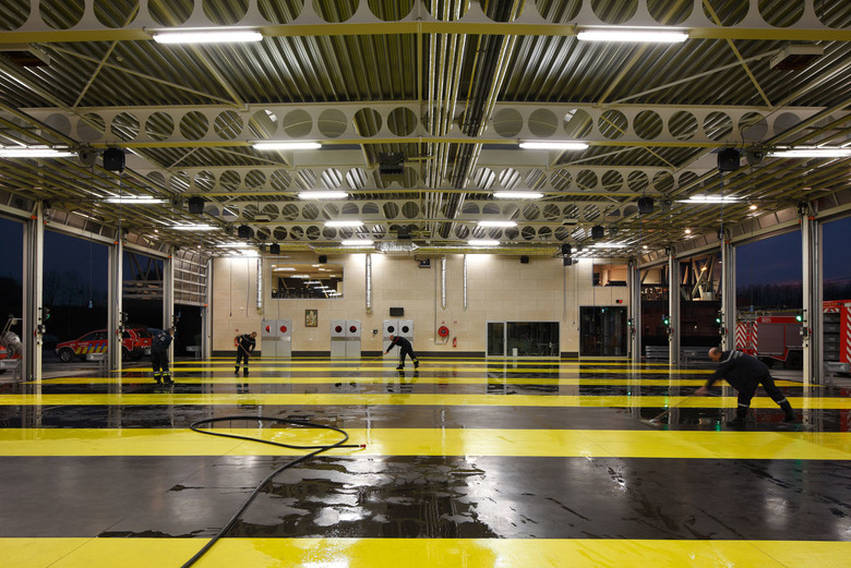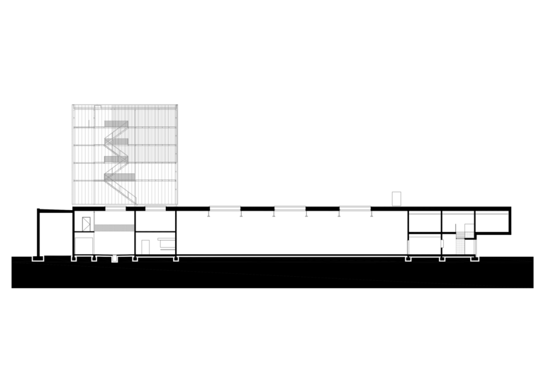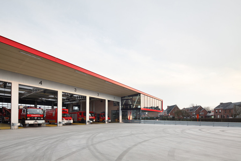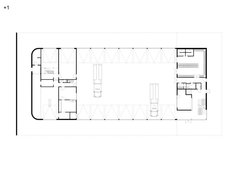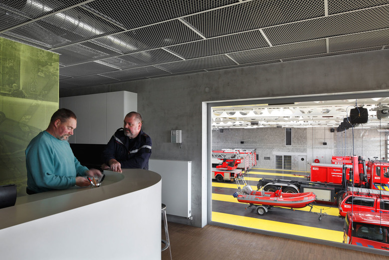 De finaliteit is strak, haast koelbloedig met in het epicentrum de grote remise waarop het secretariaat, de werk-, fitness- en leefruimte uitkijken. Deze grote buikruimte betrekt de verschillende onderdelen van de kazerne in één geheel. Het transformeert het in wezen extreem technische gebouw tot een ruimte voor gemeenschapsleven. De kazerne werkt als een humane biotoop. dus toch meer dan het machinale.
