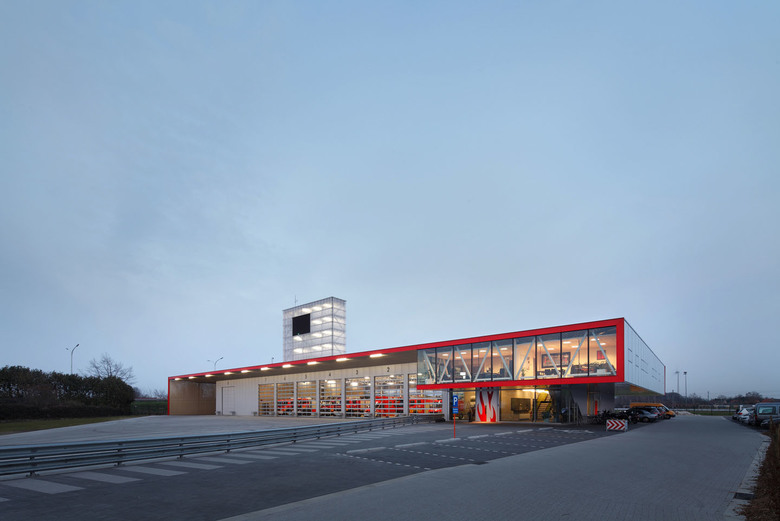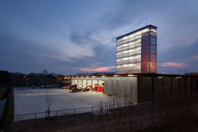 “De nieuwe kazerne voor het vrijwilligerkorps van Puurs staat als de poortwachter van de stad langs de N16. Haar toren – een droogtoren voor de brandslangen én lichtgevend billboard voor het korps en de gemeente – troont potig boven het talud van de nabijgelegen brug. De brandweerkazerne zegt niet zomaar: ‘Hier waken wij over u’. Neen, de brandweerkazerne schreeuwt met een Las Vegas-taaltje, zoals op de nabijgelegen A12, haar boodschap uit van dienstbaarheid en efficiëntie.”*