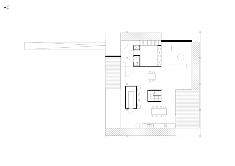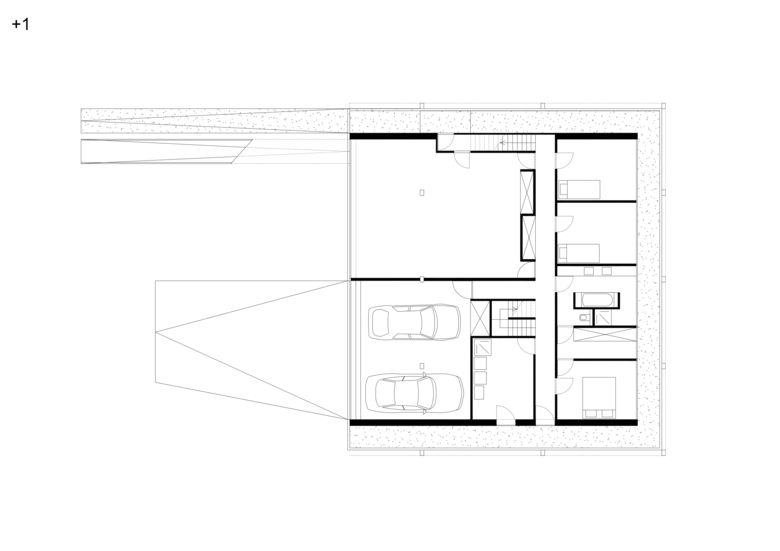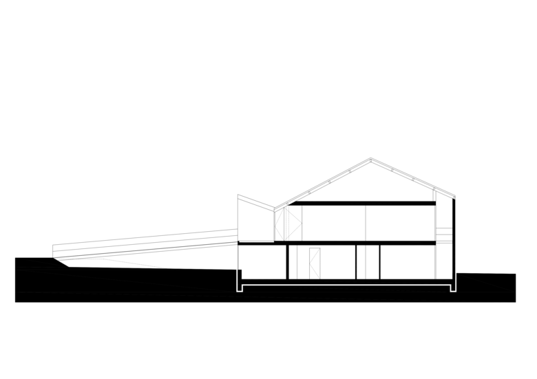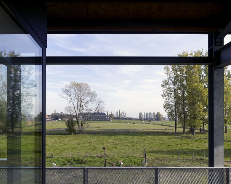 Het behoud van de bestaande topografie beschouwen we als een eerste duidelijke ontwerpzet. Dit leidt direct tot een andersoortige indeling van de woonst: het leven gebeurt op +1, het slapen op het gelijkvloers. Ten opzichte van de straat leeft men op een bel etage. Een (momenteel nog ontbrekende) loopbrug verbindt straat en leefniveau. Door dit bel etage principe, krijgt de leefruimte een panoramisch zicht op de omgevende akkers en weiden.