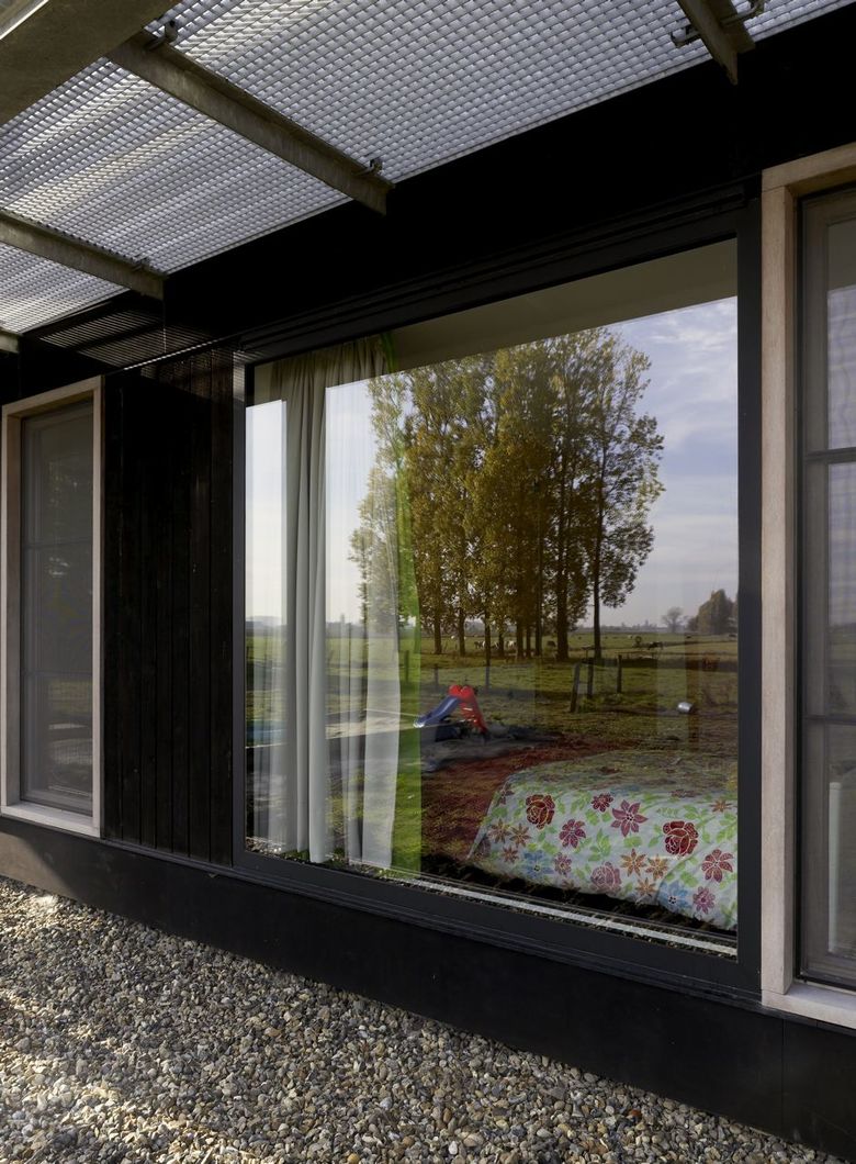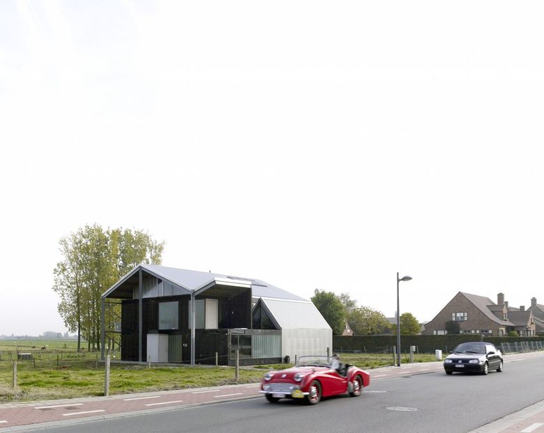 Deze woning echter, wijkt van dit principe af doordat ze zich op het natuurlijke maaiveld inplant, lager dan de straat. Hierdoor distantieert ze zich onmiddellijk van haar buren -en bij uitbreiding- van het doorsnee bouwen in een typisch Vlaamse buitengebied.