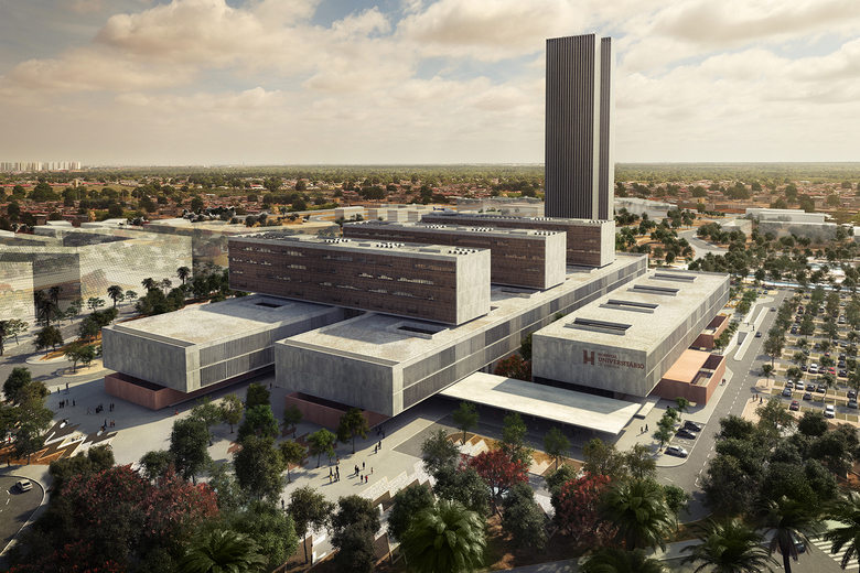 O Hospital Universitário de Luanda insere-se no loteamento da Vila Rubra, parte integrante do Plano do Distrito Residencial do Camama. Esta nova cidade residencial, localizada a 20 Kms a sul de Luanda e se expande por 1 200 Ha, pretende ser uma resposta alternativa ao centro da Capital, absorvendo parte da expansão populacional de Luanda numa previsão ocupacional de 150 mil pessoas. Uma das partes deste todo é a Vila Rubra que se expande por 150Ha. O Hospital Universitário de Luanda é parte integrante desta Vila, com cerca de 8Ha, onde se propõe uma cortina vegetal que abrace todo o campus da edificação, assegurando uma atmosfera calma, de contemplação e vivência do silêncio, ideal para um centro de saúde. Prolonga-se inclusivamente para o interior do edifício, onde, através de diversas transparências, pátios e jardins suspensos, esbate-se a fronteira entre exterior e interior. Com uma previsão de resposta aos cuidados de saúde para cerca de 100 mil pessoas, o hospital é composto por seis volumes (3+3 paralelepípedos sobrepostos, de três pisos), finamente estruturados e interligados entre si, distintos em programa e tipologia, mas geometricamente relacionados e escavados por inúmeros pátios com muita luz natural. Esta apurada conjugação desconstrói a compacta frieza espacial que os hospitais habitualmente comportam, assumindo a sua dimensão humana.