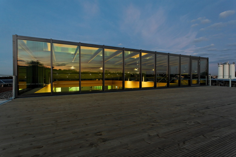 Konzept – Der kompakte, 3-geschossige Baukörper basiert auf einem quadratischen Grundriss mit rund 38 m Kantenlänge und einem innen liegenden, glasüberdeckten Atrium. Er weist ein sehr gutes Verhältnis der Gebäudehüllfläche zum beheizten Gebäudevolumen (A/V Verhältnis) auf. Die Grundfläche bilden jeweils zwei sich gegenüberliegende Winkel. Sie sind geschossweise gestapelt und um 90° gegeneinander verdreht. Auf diese Weise entsteht der besondere Innenraum mit den charakteristischen Terrassen. Diese liegen sich auf jedem Geschoss gegenüber und bieten ein Angebot an den Nutzer zur Kommunikation und informellen Nutzung.