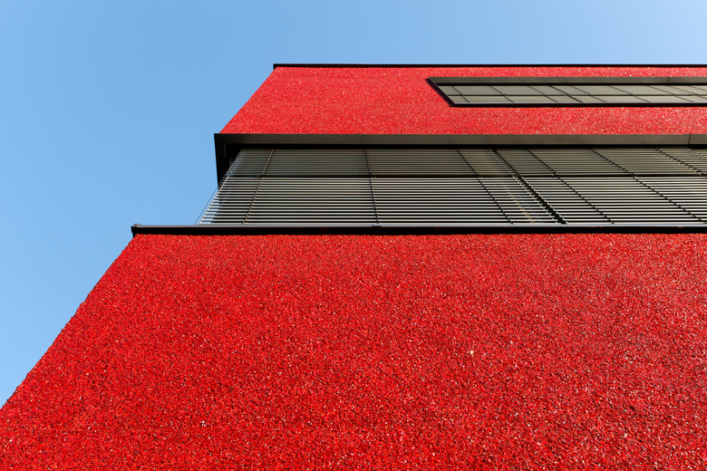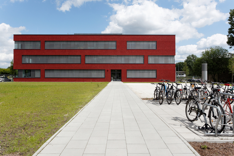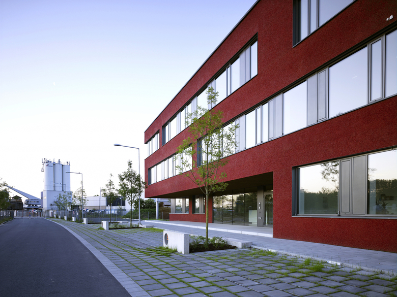 Außen vs. Innen – Der anspruchsvollen Bauaufgabe entsprechend erhalten die Außenfassaden eine besondere Gestaltung. Eine Putzbekleidung mit einem Zuschlag aus rotem, gebrochenem Glas, lassen den kubischen Baukörper in der Sonne strahlen und glitzern. Farblich harmonisch in das Umfeld aus roten Ziegelbauten eingefügt, bewahrt sich der Baukörper auf diese Weise sein Alleinstellungsmerkmal. Mit der Bewegung des Betrachters und unterschiedlichen Belichtungssituationen innerhalb eines Tages wechselt der Baukörper ständig seine äußere Erscheinung und lädt zur Entdeckung ein. Der besondere und aufgrund der räumlichen Struktur entstehende zentrale Innenraum erfährt ebenfalls in seiner Materialität eine besondere Inszenierung. Die gesamten Oberflächen der Decken und Wände sind im Etrium als akustisch wirksame Holzverkleidungen, die Bodenbeläge des Atriums und der Terrassen als Parkettbelag ausgeführt. Dadurch erhält der Innenraum einen besonderen, wohnlichen und eher informellen Charakter. Pflanzbecken und Sitzobjekte ergänzen die Wahl der Materialien.