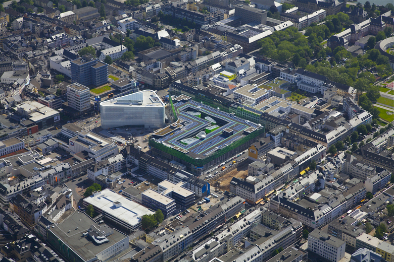 The shopping mall ´Forum Mittelrhein´ and the Kulturbau ‘Forum Confluentes’ together form the design for the redevelopment of the central square of Koblenz. This square, the Zentralplatz (Central Square), not only connects the various districts of Koblenz with each other but also has an important function as a public transport interchange and place where various pedestrian flows come together.