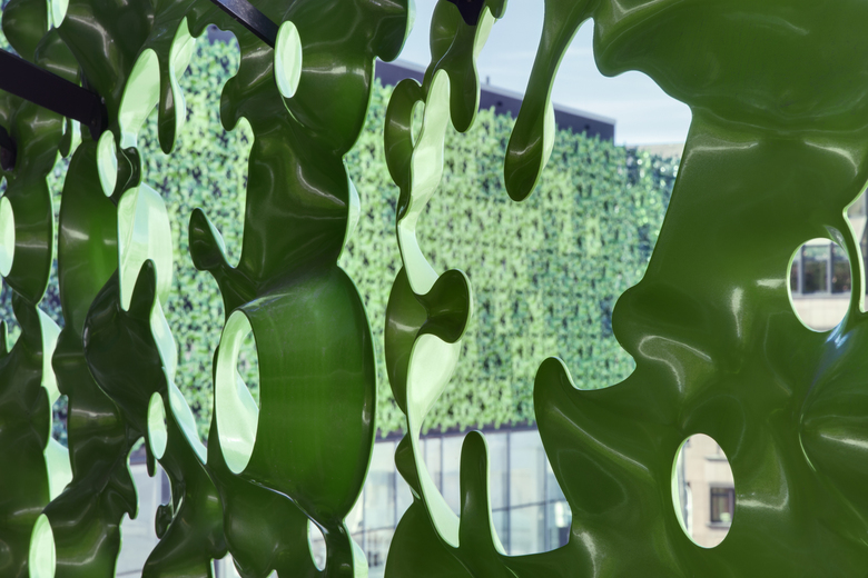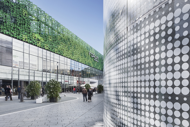The top three floors of the building are dominated by an artificial "Weinlaub façade" (wine leaf façade). The basis of the structure is an abstract image of a vine leaf, which is interpreted freely as a 3D-shape. The entire façade is composed out of only one type of element, that is produced in large quantities and high quality in an industrial thermoforming process. Approximately 2,900 identical, three-dimensional shaped aluminum elements, painted in three different shades of green, form this distinctive façade.