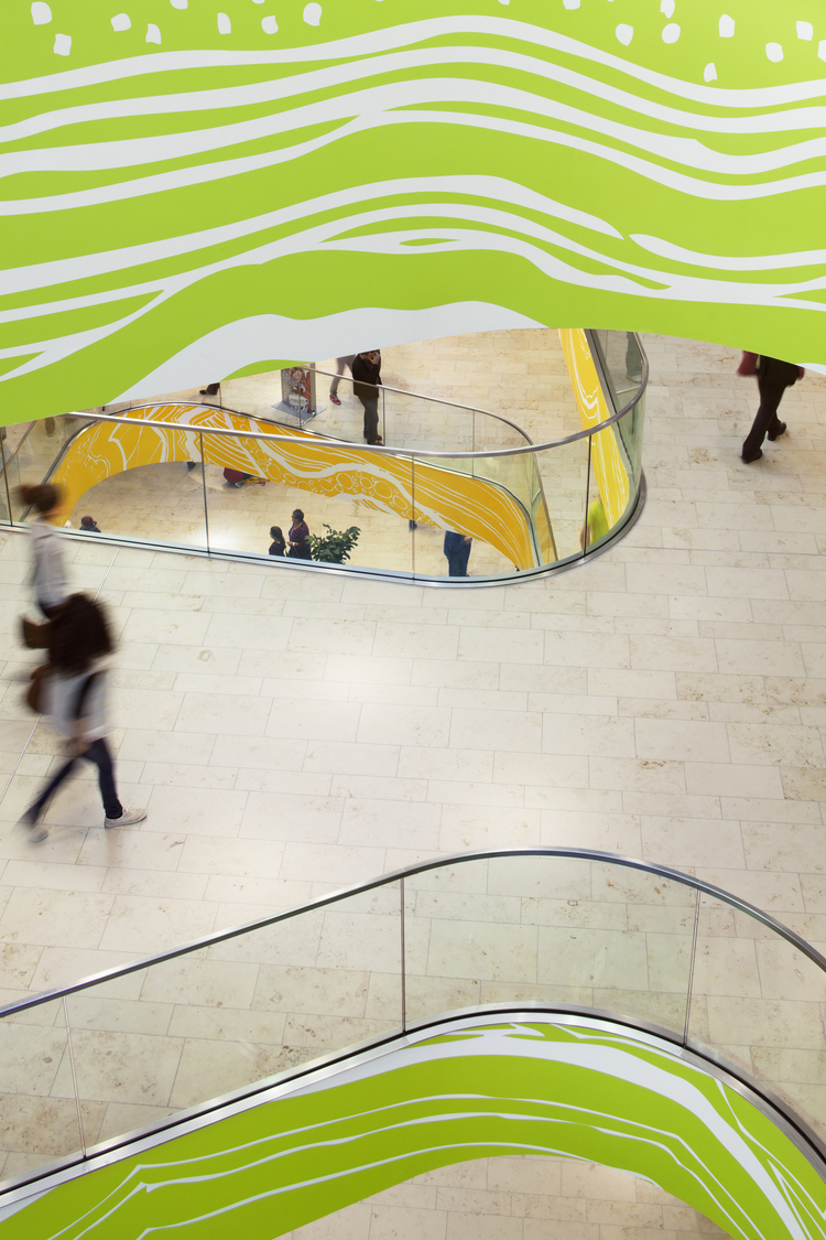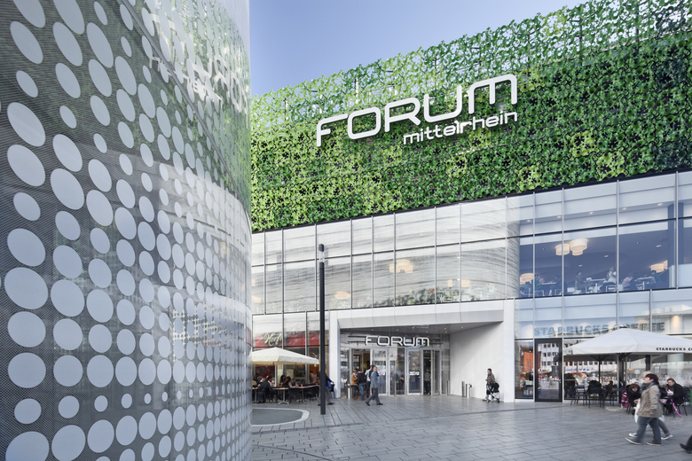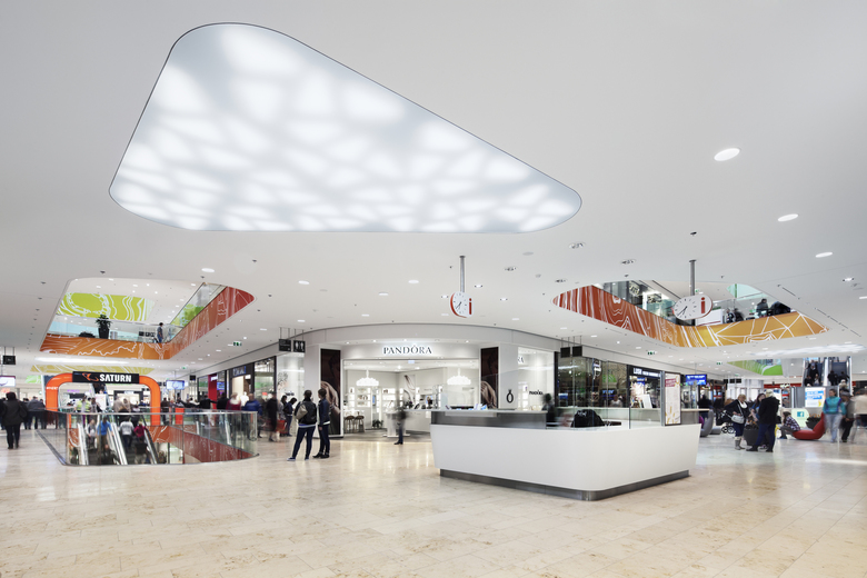 The mall Forum Mittelrhein presents itself as a flat, horizontal layered structure. On relevant junctions within the urban fabric, the mall offers spacious entrances and invites visitors to follow the pedestrian flows and to ‘glide’ through the building. The shopping center is characterized by its trapezoidal layout and smooth outlines. The areas intertwined with escalators provide orientation points, divide the building and provide the interior with natural light. This, in combination with the great spaciousness, gives a high-level of amenity and a pleasant ambience for the user. Across the intense colors of the void edges, powerful accentuations are applied that create a vivid image.