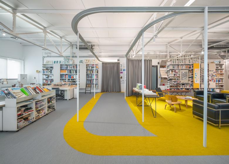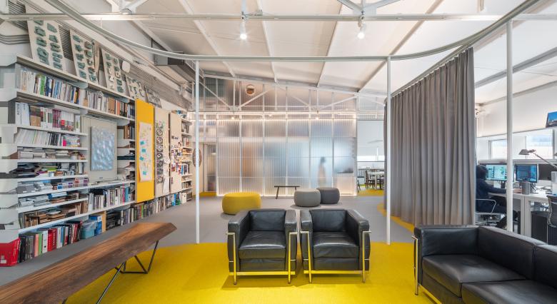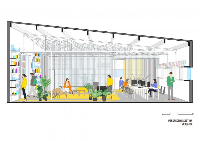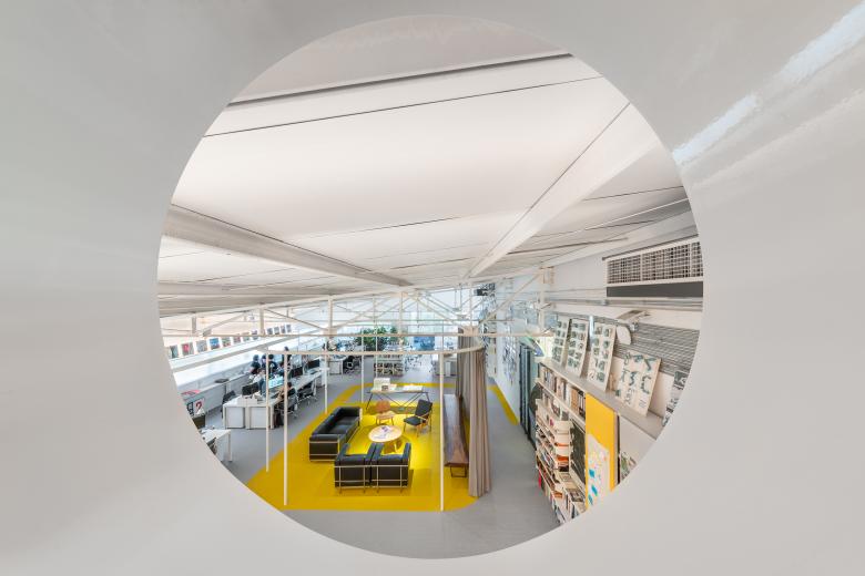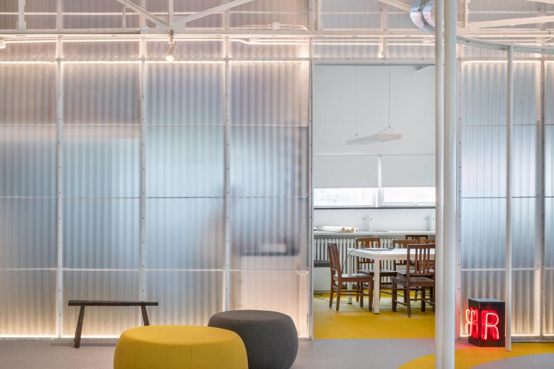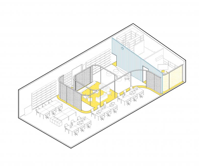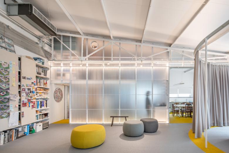 A functional area offers separated meeting rooms, kitchen, storage and rest areas that are included into a former repurposed mezzanine level to maximize organization. These rooms are physically separated with a semi-transparent double layered wall made out of polycarbonate corrugated panels. The only continuous solid wall without windows accommodates a vast shelf that includes the material and reference library, together with a selection of models and Crossboundaries Award display.