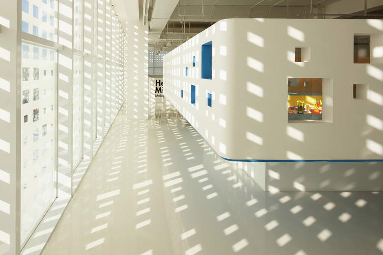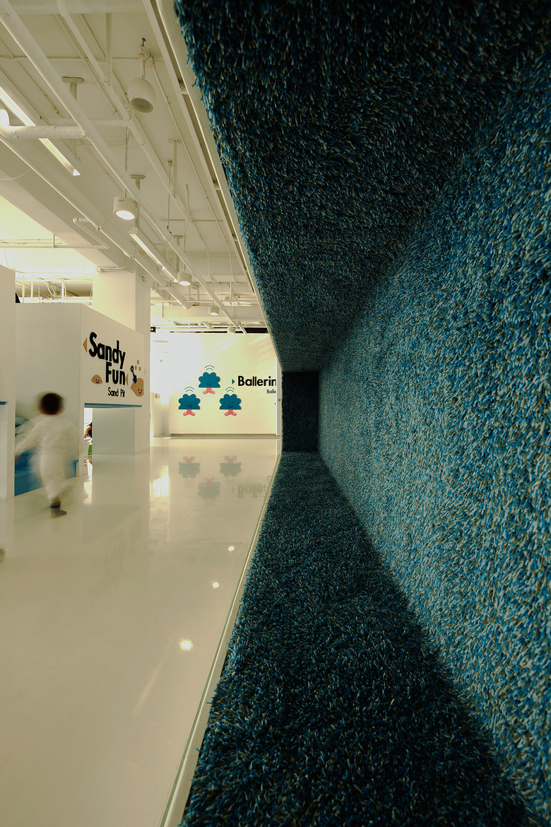Freestanding activity boxesbreak the rigid layout of the columns and arches soften the rhythm of the structure. Each box has its own program or theme. Inside they engage children in activity while parents have a peep inside to see what is going on through square openings.