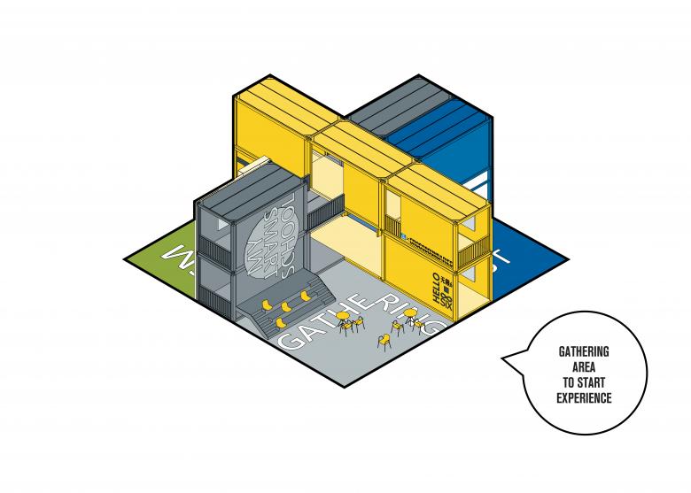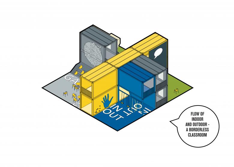 Crossboundaries’ latest installation is imagined as a fun inducing manifesto of future schools, where you can experience and imagine little glimpses of its principles. The installation is a part of the group exhibition for 2019 Shenzhen-Hong Kong Biennale themed around potential models for future schools and the possibilities of prefabrication and modularization in the realm of educational buildings. The group exhibition contains five installations in total, all utilizing the standard shipping container module provided by the organizers.